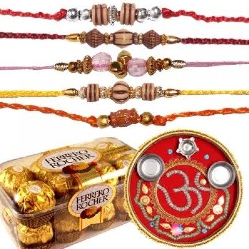 Designer rakhi thali with Roli n Chawal, 5 Designed rakhis, n yummy Ferrero Rocher Chocolates contains 16 pieces. An amazing rakhi gift for your brother. Send This Unique rakhi gift to your loving brother. send this rakhi gift hampers for my brother in Coimbatore. send the order through Coimbatoregiftsflowers.com