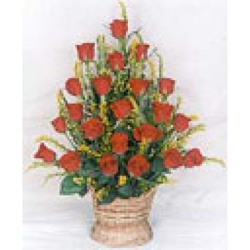 - Celebrate love with this stunning arrangement of 50 red roses nestled beautifully in a decorative basket.